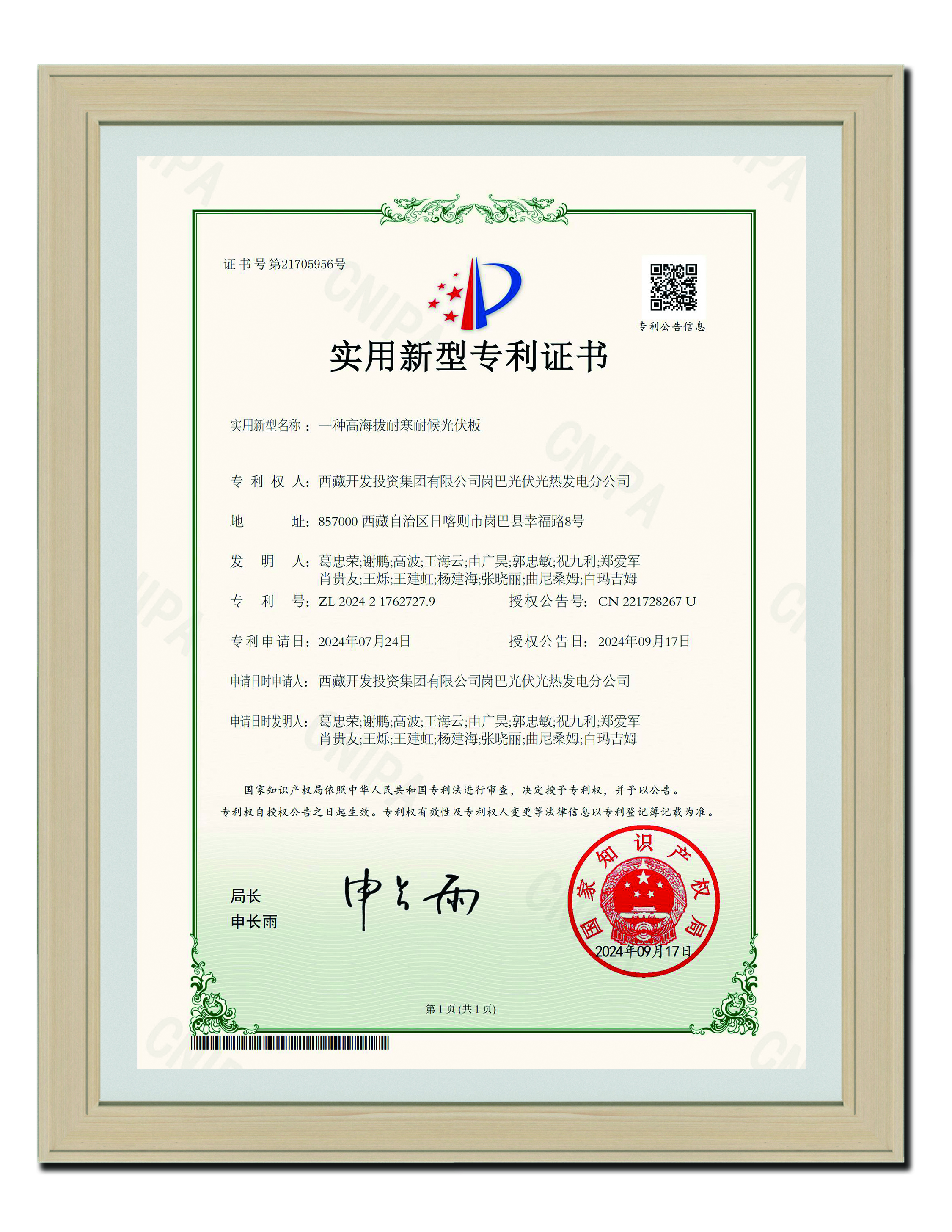 2024-09-17 實(shí)用新型專(zhuān)利證書(shū)_一種高海拔耐寒耐候光伏板