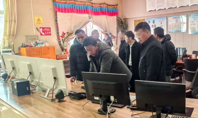 羅布次仁(左二)在滿(mǎn)拉水利樞紐工程調度室調研。