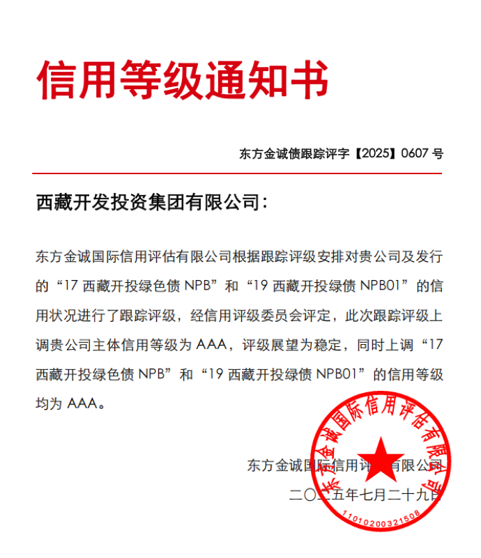 7月29日,經(jīng)國內權威信用評級機構(東方金誠國際信用評估有限公司)評審認定,西藏開(kāi)發(fā)投資集團有限公司(以下簡(jiǎn)稱(chēng)“西藏開(kāi)投集團”)獲評AAA主體信用等級,評級展望為“穩定”,成為自治區第一家國有AAA企業(yè),標志著(zhù)自治區成功培育出首家本地主體信用等級AAA企業(yè),填補了我區最高等級國有信用主體的空白。