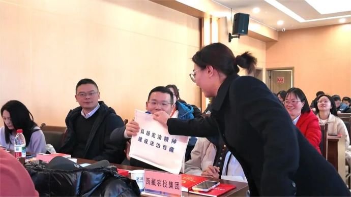 活動(dòng)現場(chǎng),一系列內容豐富、形式新穎的環(huán)節有序開(kāi)展。參會(huì )人員集中觀(guān)看了憲法精神主題影片及“憲法進(jìn)企業(yè)”主題紀錄片,直觀(guān)感受憲法的崇高權威與實(shí)踐力量;活動(dòng)特邀西藏歐珠律師事務(wù)所律師歐珠永青作《憲法》專(zhuān)題講座,深入淺出解讀憲法核心要義與依法治企實(shí)踐路徑,充分闡釋了新時(shí)代《憲法》的新發(fā)展,引發(fā)廣泛共鳴;憲法趣味有獎問(wèn)答互動(dòng)環(huán)節氛圍熱烈,有效調動(dòng)了干部職工學(xué)法用法的積極性;活動(dòng)還設置了現場(chǎng)法律咨詢(xún)環(huán)節,幫助干部職工解決工作生活中遇到的法律問(wèn)題,號召大家爭做“學(xué)法先鋒、守法模范、用法表率”。