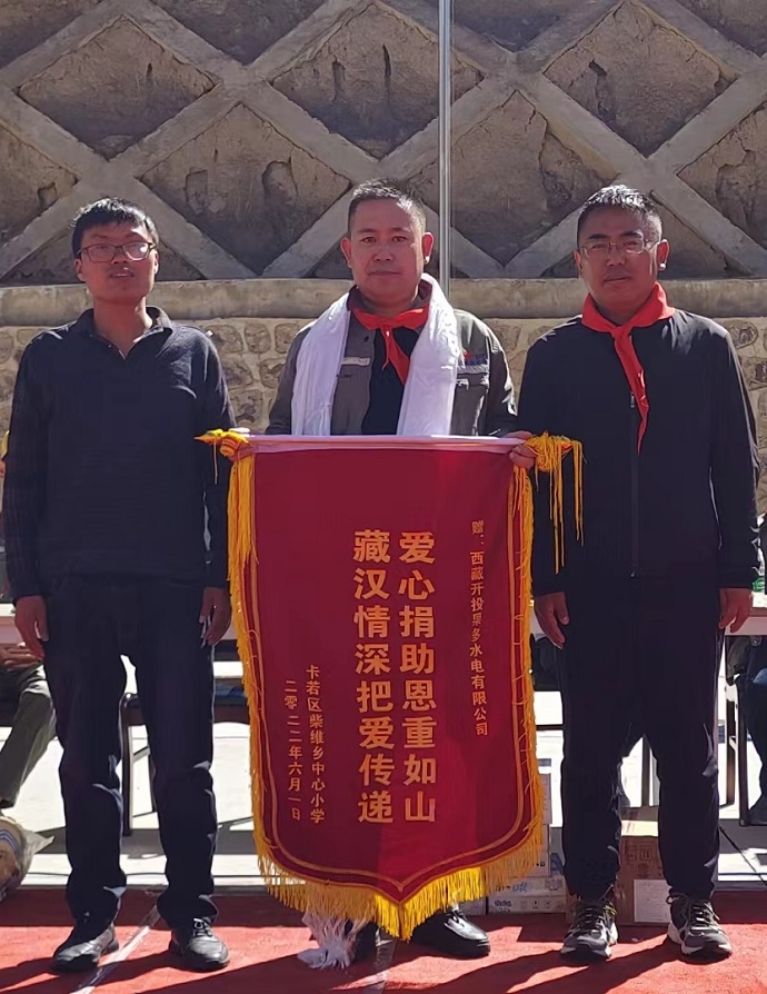 果多水電公司代表張二林同志作了題為“祖國的未來(lái),民族的希望”的講話(huà),并代表果多水電公司給學(xué)校捐贈了學(xué)習用品,足球、排球、羽毛球等,勉勵孩子們要樹(shù)立遠大理想,努力學(xué)習,健康成長(cháng),以?xún)?yōu)異的成績(jì)回報社會(huì )、回報祖國。柴維鄉小學(xué)贈送了“愛(ài)心捐助恩重如山,藏漢情深把愛(ài)傳遞”的錦旗,感謝果多水電公司對學(xué)校的關(guān)心支持幫助。