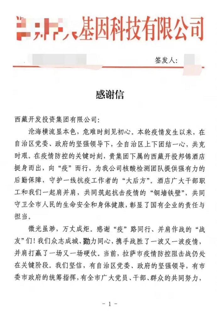 該核酸檢測機構總部在感謝信中表示,本輪疫情發(fā)生以來(lái),在自治區黨委、政府的堅強領(lǐng)導下,全區上下團結一心,共克時(shí)艱。在疫情防控的關(guān)鍵時(shí)刻,西藏開(kāi)投邦錦花園酒店挺身而出,向“疫”而行,為該核酸檢測機構的核酸檢測團隊提供強有力的后勤保障,守護一線(xiàn)抗疫工作者的“大后方”。酒店廣大干部職工和我們一起肩并肩,共同筑起抗擊疫情的“銅墻鐵壁”,共同守衛全市人民的生命安全和身體健康,彰顯了國有企業(yè)的責任與擔當。