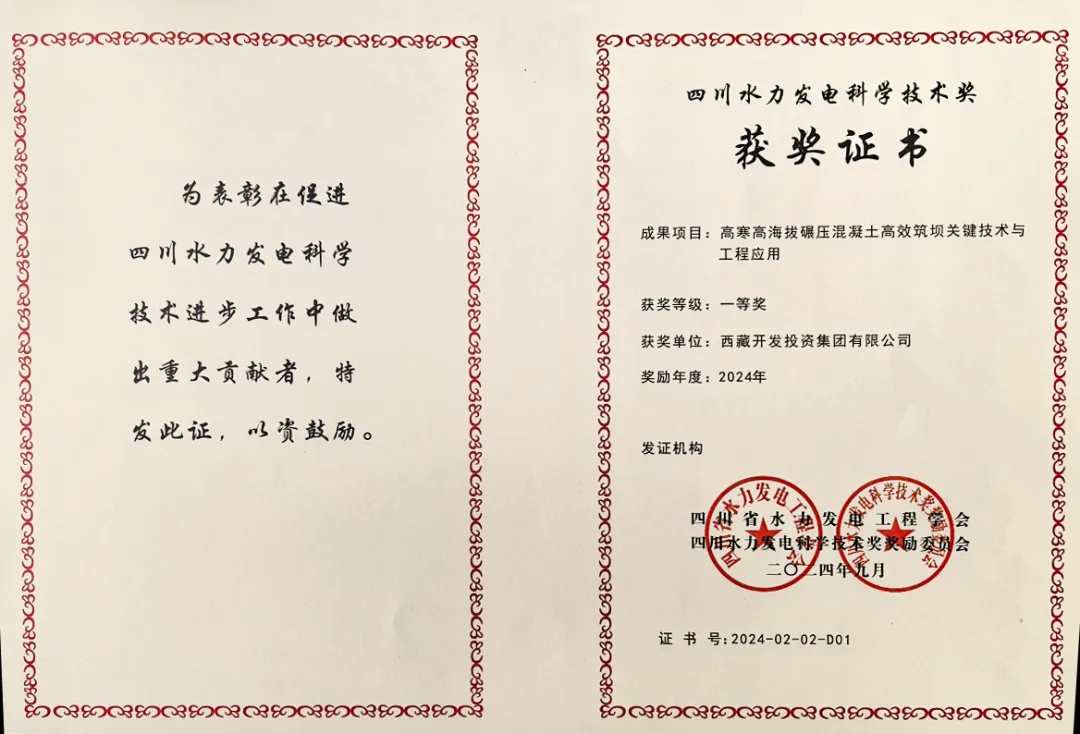 9月25日,四川省水力發(fā)電工程學(xué)會(huì )2024年度學(xué)術(shù)年會(huì )在成都召開(kāi),并舉辦2024年四川水力發(fā)電科學(xué)技術(shù)獎頒獎典禮,西藏開(kāi)投集團果多水電站創(chuàng )新成果“高寒高海拔碾壓混凝土高效筑壩關(guān)鍵技術(shù)與工程應用”榮獲四川水力發(fā)電科學(xué)技術(shù)獎一等獎。