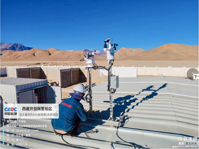 ▲日土光伏項目,現場(chǎng)施工人員開(kāi)展光功率預測環(huán)境檢測儀安裝作業(yè)。