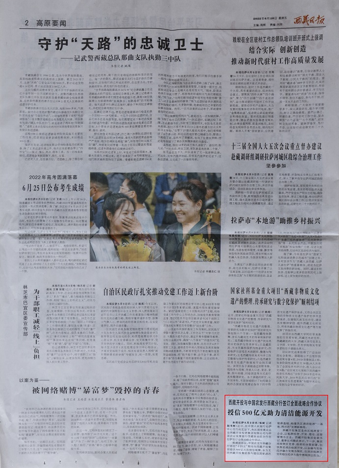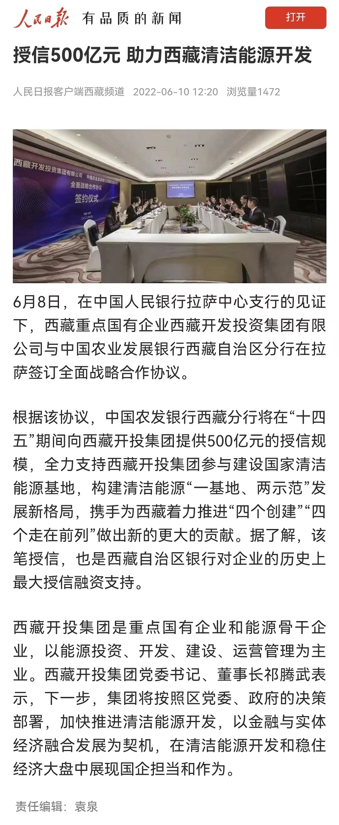 ?。ň幷甙矗?月10日,《人民日報》客戶(hù)端西藏頻道報道了《授信500億元  助力西藏清潔能源開(kāi)發(fā)》?!段鞑厝請蟆?022年6月10日在第2版“高原要聞”欄目刊登文章,報道《授信500億元|西藏開(kāi)投集團與中國農發(fā)行西藏分行簽訂全面戰略合作協(xié)議》。西藏電視臺2022年6月10日在西藏電視臺影視文化頻道《今晚九點(diǎn)》欄目報道了《授信500億元|西藏開(kāi)投集團與中國農發(fā)行西藏分行簽訂全面戰略合作協(xié)議》,《珠峰云》平臺同步播放。新華網(wǎng)、經(jīng)濟日報、西藏衛視、西藏日報客戶(hù)端、網(wǎng)信西藏、今日頭條等媒體均報道了相關(guān)新聞。全文如下: