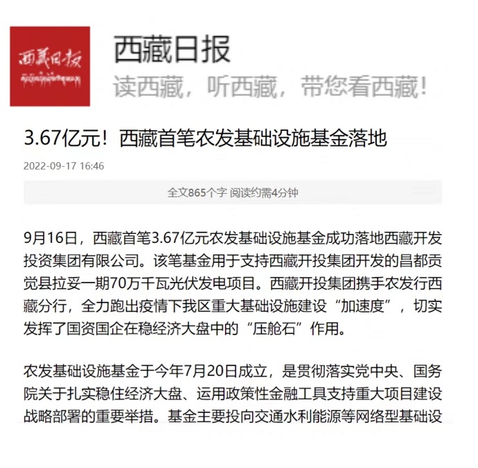 ?。ň幷甙矗段鞑厝請蟆?022年9月17日報道西藏首筆農發(fā)基礎設施基金落地西藏開(kāi)投集團。全文如下: