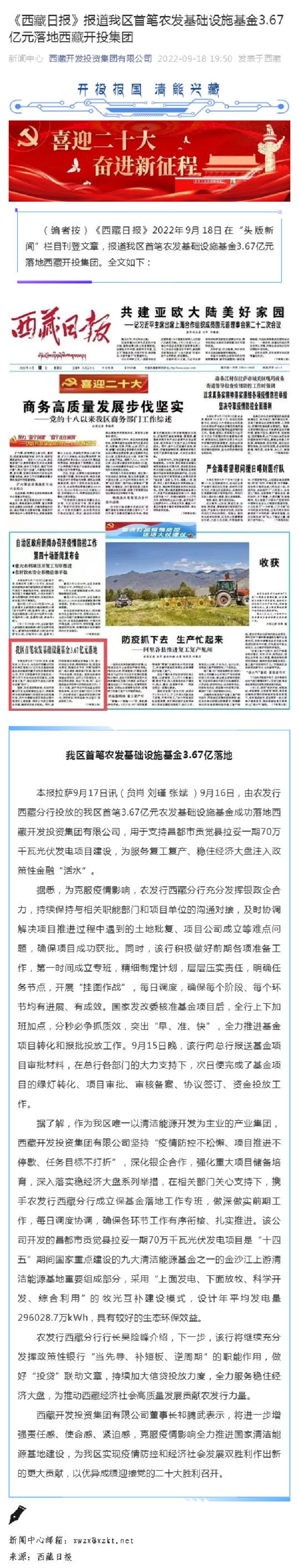 《西藏日報》報道我區首筆農發(fā)基礎設施基金3.67億元落地西藏開(kāi)投集團