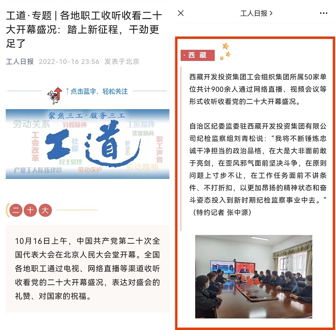 ?。ň幷甙矗豆と巳請蟆?022年10月16日報道《各地職工收聽(tīng)收看二十大開(kāi)幕盛況:踏上新征程,干勁更足了》專(zhuān)題報道,文章引用部分集團公司新聞信息。