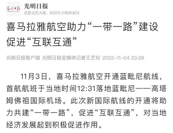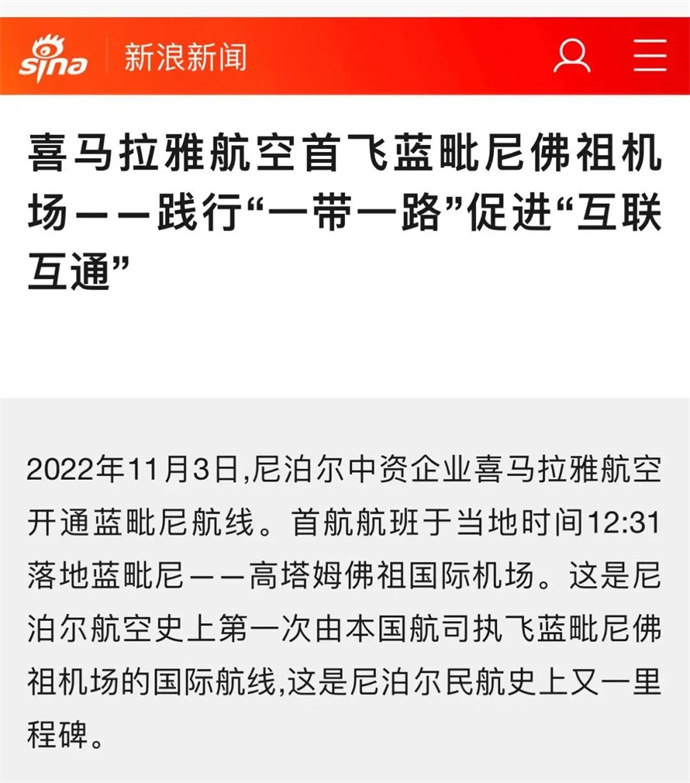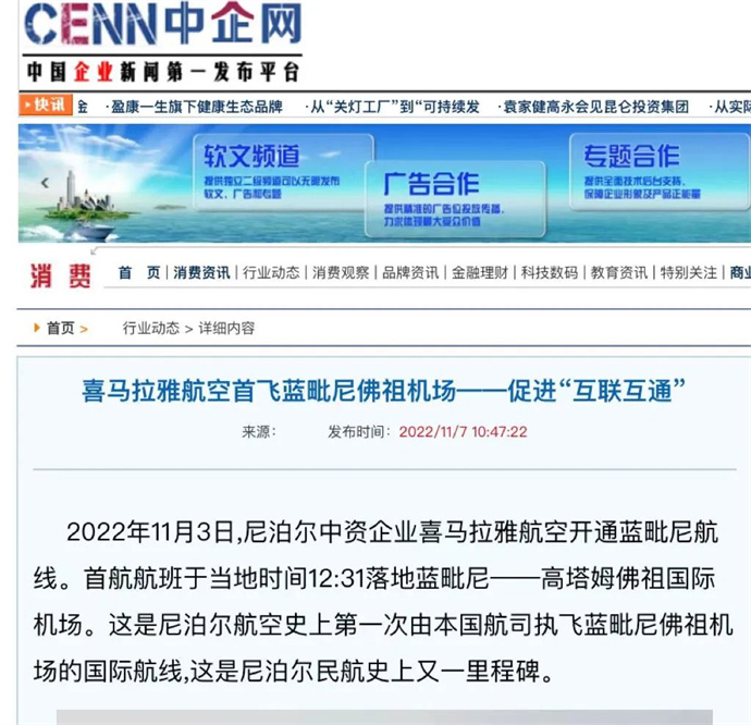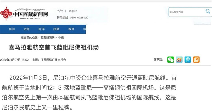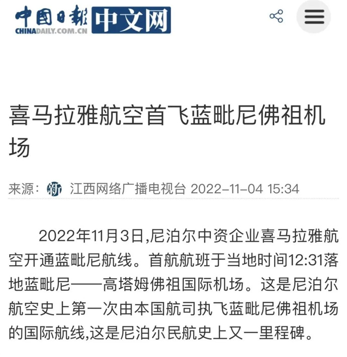 中華網(wǎng)、中國網(wǎng)、中企網(wǎng)、中國日報、光明日報、中國旅游新聞網(wǎng)、中國西藏新聞網(wǎng)、拉薩新聞網(wǎng)等媒體報道喜航開(kāi)通加德滿(mǎn)都至藍毗尼航線(xiàn)