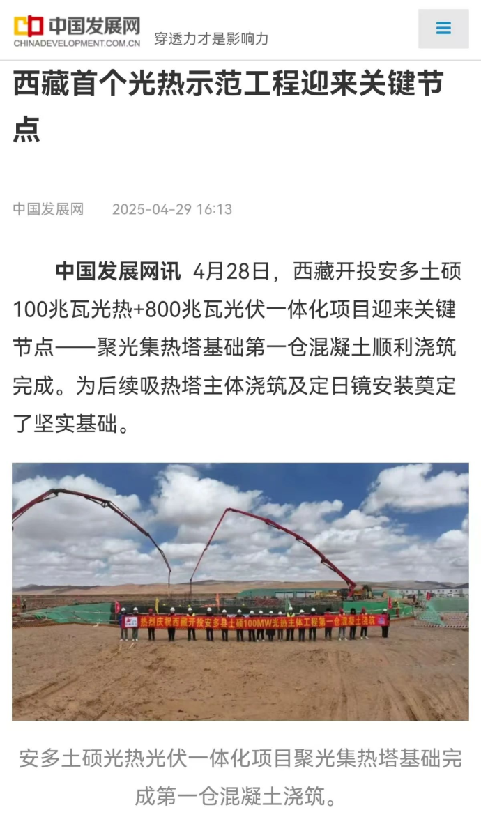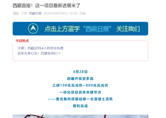 媒體報道丨西藏首個(gè)光熱示范工程迎來(lái)關(guān)鍵節點(diǎn)