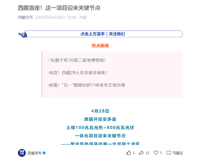近日,西藏首個(gè)光熱示范工程——西藏開(kāi)投安多土碩光熱一體化項目建設迎來(lái)關(guān)鍵節點(diǎn)的消息,被中國發(fā)展網(wǎng)、西藏日報、西藏發(fā)布等各級媒體平臺宣傳報道,提升了集團品牌影響力和產(chǎn)業(yè)發(fā)展的傳播力。