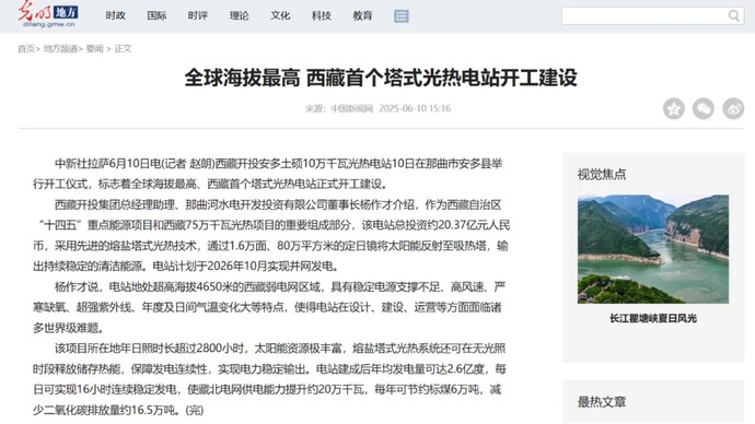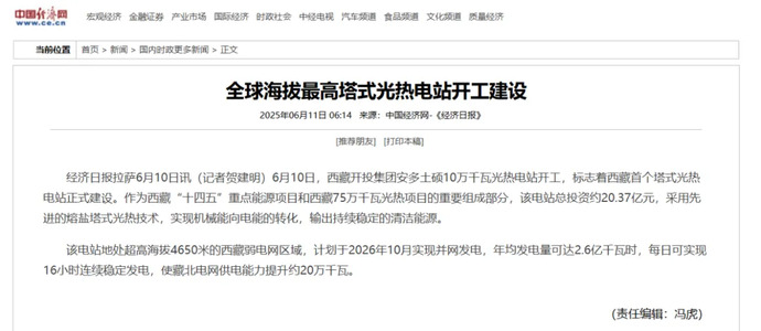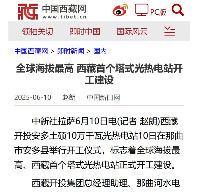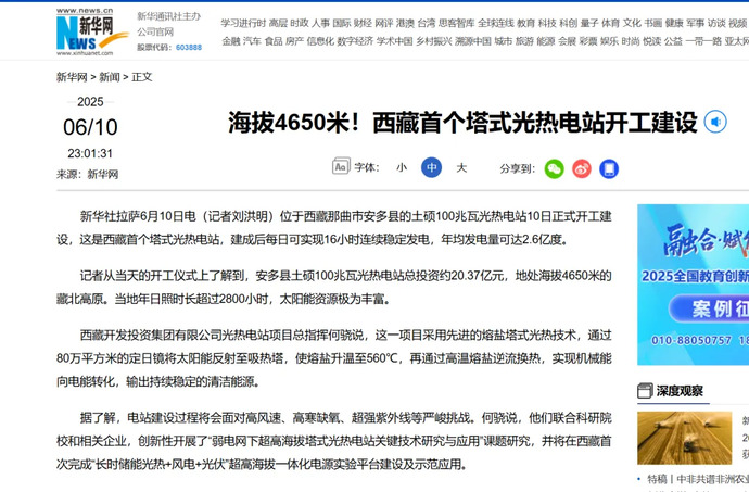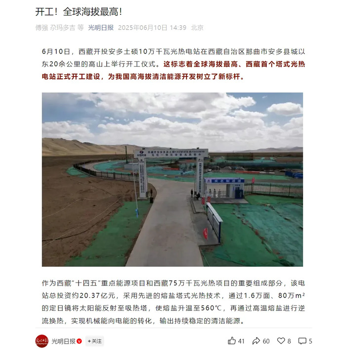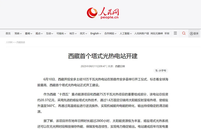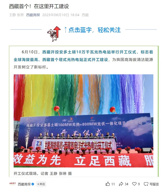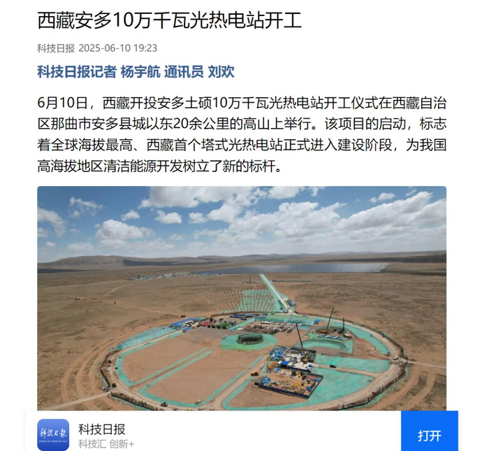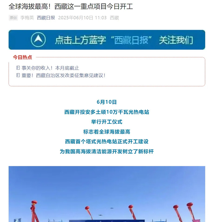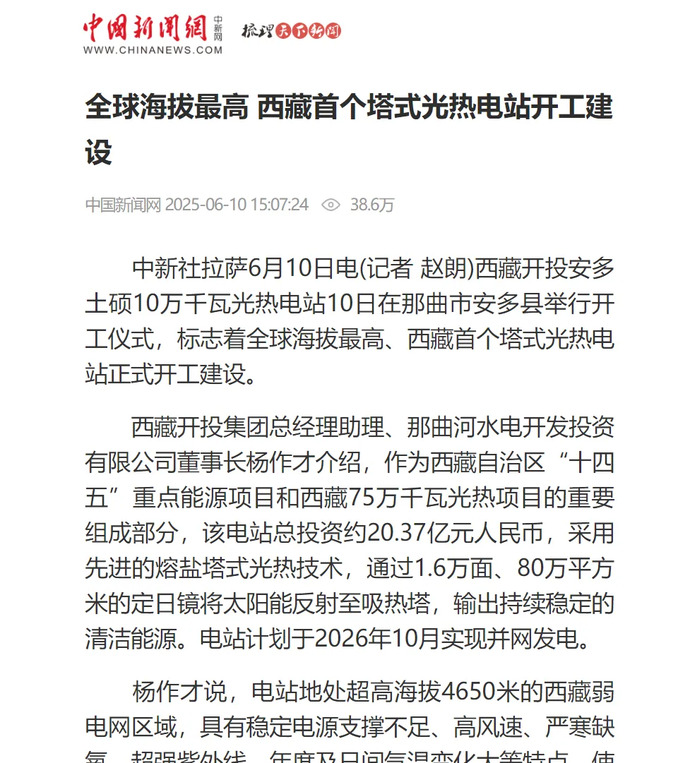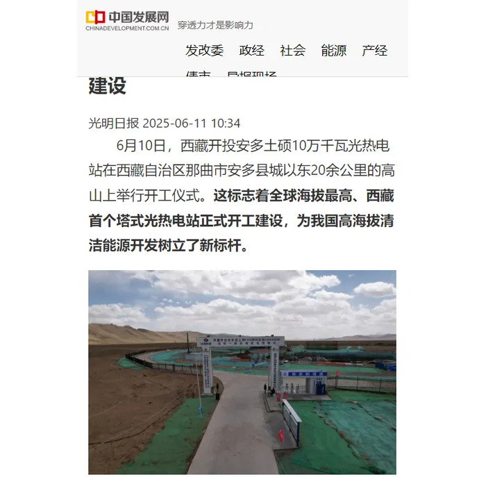 媒體報道丨全球海拔最高、西藏首個(gè)塔式光熱電站開(kāi)工建設