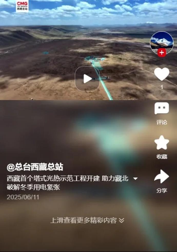 6月10日,全球海拔最高、西藏首個(gè)塔式光熱項目——西藏開(kāi)投安多土碩100MW光熱電站正式開(kāi)工建設的消息,被人民網(wǎng)、新華網(wǎng)、央視、光明日報、經(jīng)濟日報、科技日報、中國新聞網(wǎng)、中國西藏網(wǎng)、中國發(fā)展網(wǎng)、西藏發(fā)布、西藏日報、西藏廣播電視臺、西藏商報、安多縣廣播電視臺等各級媒體平臺宣傳報道,有力提升了集團品牌影響力和產(chǎn)業(yè)發(fā)展的傳播力。