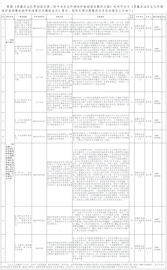 西藏開(kāi)投海通水泥有限公司關(guān)于第二輪中央生態(tài)環(huán)境保護督察反饋問(wèn)題整改落實(shí)情況的公示
