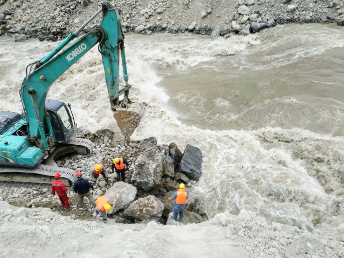 7月4日受持續強降雨影響,易貢藏布河水暴漲,7月5日凌晨5時(shí),金橋水電站壩前水位達到3412.86米,施工區水流量達到647 m3/s。24小時(shí)后,壩前水位3412.03米,已建成的右岸壩段及在建的左岸壩段因為質(zhì)量把控到位、施工組織及防洪措施到位,經(jīng)受住了洪水的考驗;但是從嘉黎縣至金橋水電站施工現場(chǎng)的100公里公路有19處路段出現不同程度損毀,其中3處路段完全中斷,沖毀路段約5公里,路基、堡坎垮塌約2公里,金橋水電站主要建材物資暫時(shí)停運,尼屋鄉2000余村民出行受阻,存在極大安全隱患,嚴重影響了受災群眾的生產(chǎn)生活。