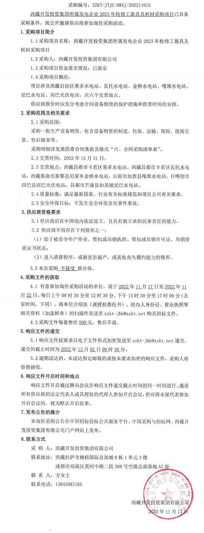 西藏開(kāi)發(fā)投資集團所屬發(fā)電企業(yè)2023年檢修工器具及耗材公告
