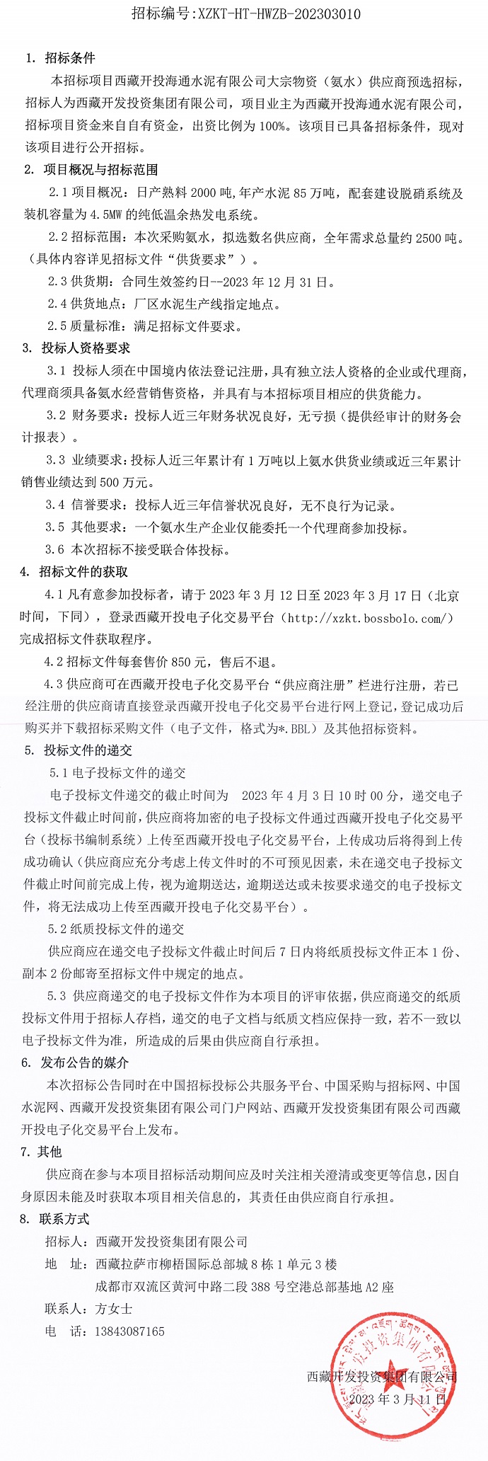 西藏開(kāi)投海通水泥有限公司大宗物資(氨水)