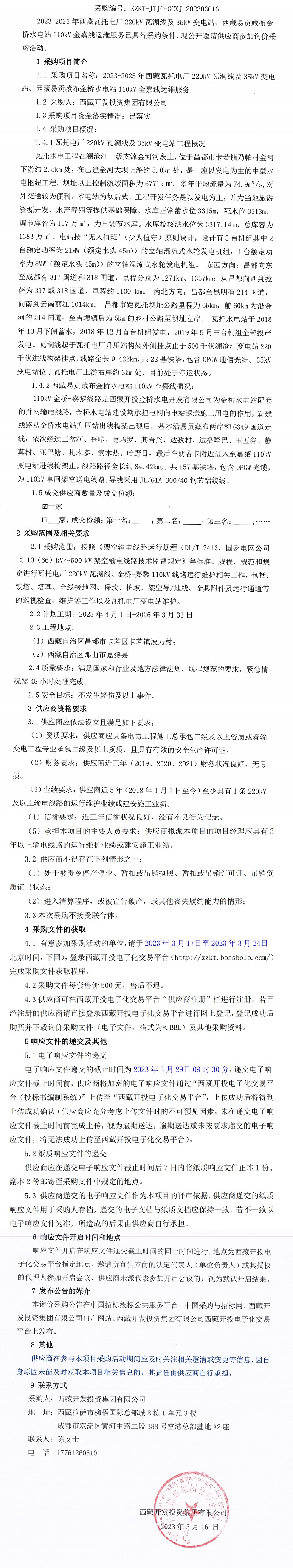 2023-2025年西藏瓦托電廠(chǎng)220kV 瓦瀾線(xiàn)及35kV變電站、西藏易貢藏布金橋水電站 110kV金嘉線(xiàn)運維服務(wù)詢(xún)價(jià)采購公告