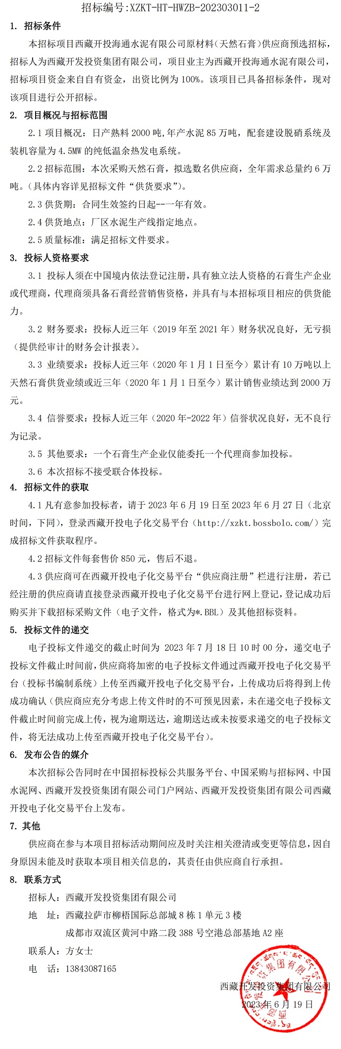 西藏開(kāi)投海通水泥有限公司原材料(天然石膏)供應商預選招標公告(二次)