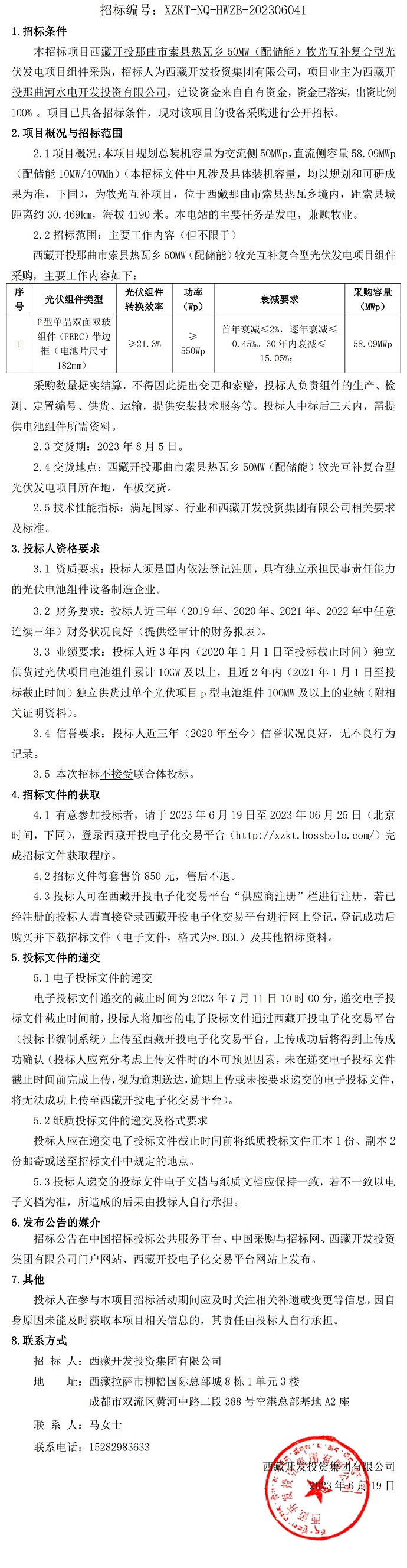 西藏開(kāi)投那曲市索縣熱瓦鄉50MW(配儲能)牧光互補復合型光伏發(fā)電項目光伏組件采購招標公告