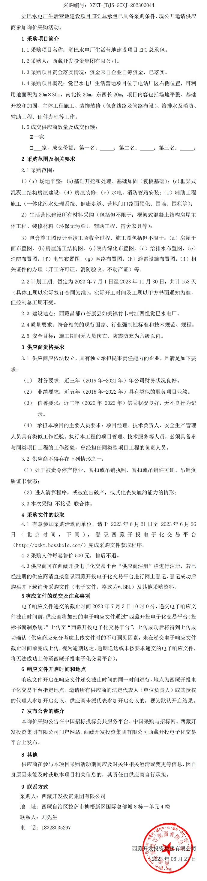 覺(jué)巴水電廠(chǎng)生活營(yíng)地建設項目EPC總承包詢(xún)價(jià)采購公告