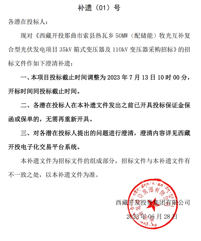 西藏開(kāi)投那曲市索縣熱瓦鄉50MW(配儲能)牧光互補復合型光伏發(fā)電項目35kV箱式變壓器及110kV變壓器采購招標