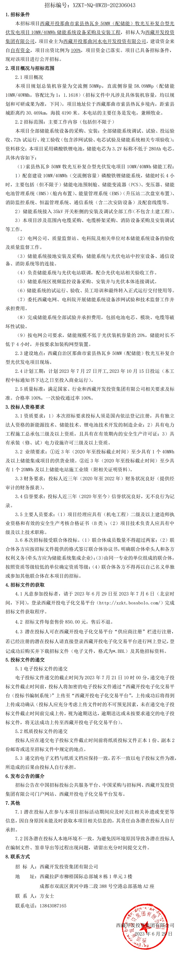 西藏開(kāi)投那曲市索縣熱瓦鄉50MW(配儲能)牧光互補復合型光伏發(fā)電項目10MW/40MWh儲能系統設備采購及安裝工程招標公告