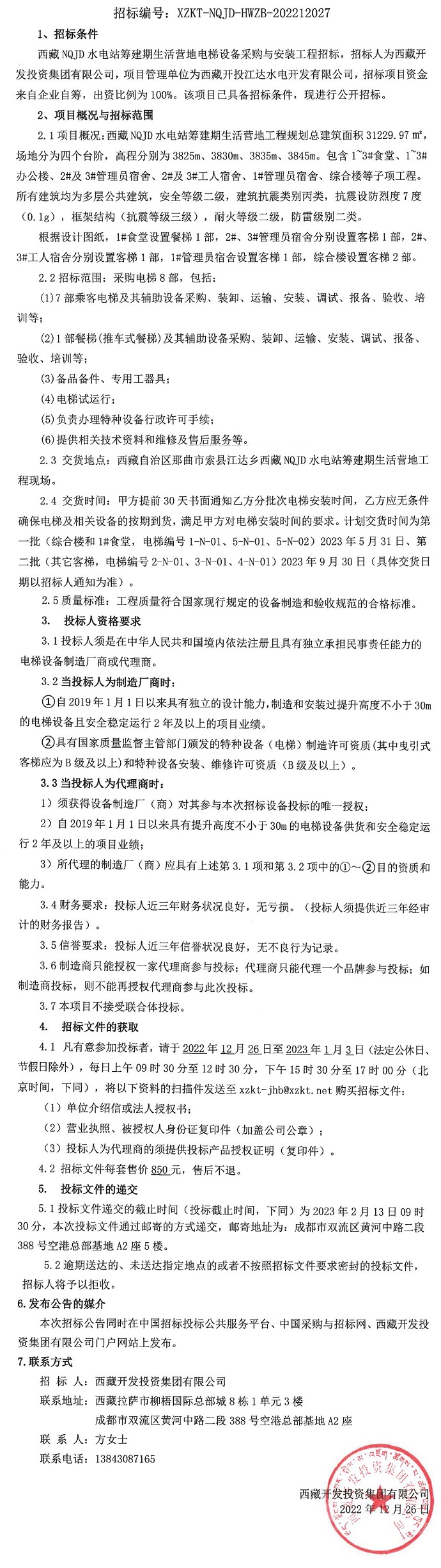 西藏NQJD水電站籌建期生活營(yíng)地電梯設備采購與安裝工程