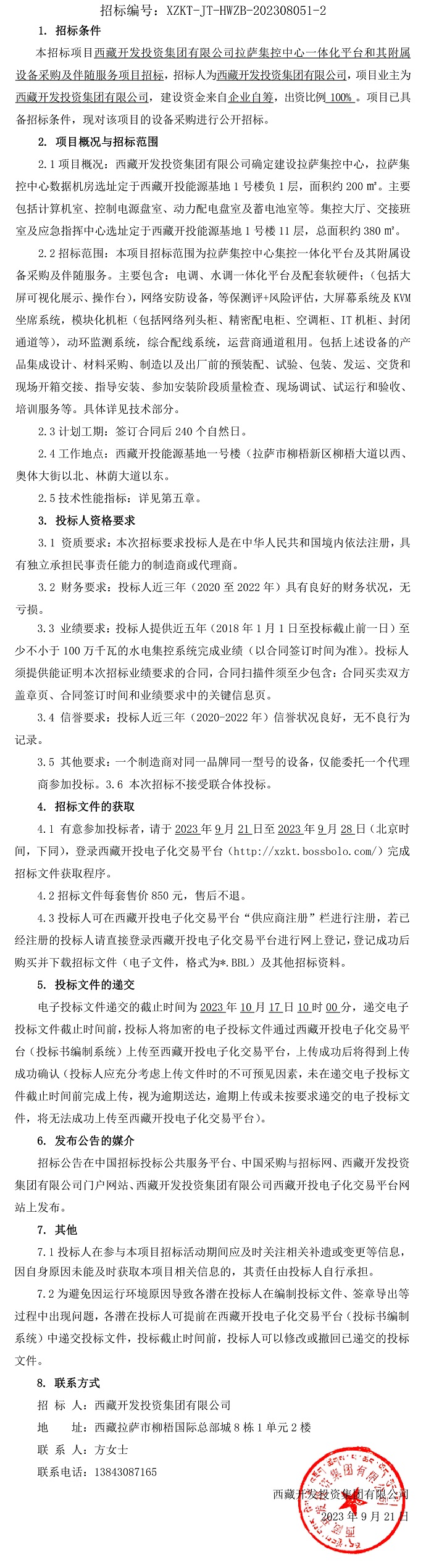 西藏開(kāi)發(fā)投資集團有限公司拉薩集控中心一體化平臺和其附屬設備采購及伴隨服務(wù)項目招標公告(第二次)