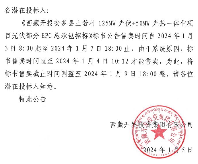 關(guān)于延長(cháng)《西藏開(kāi)投安多縣土若村125MW光伏+50MW光熱一體化項目光伏部分EPC總承包招標》標書(shū)售賣(mài)時(shí)間的公告