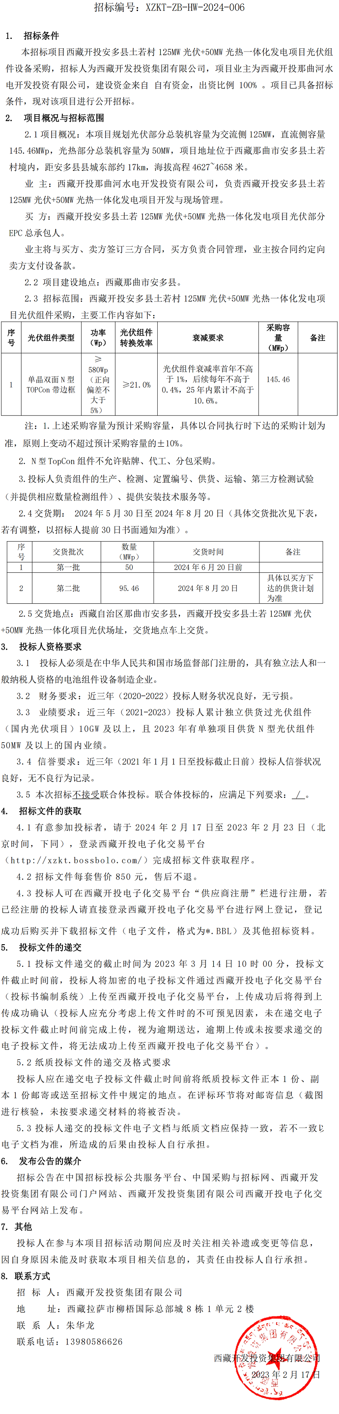 西藏開(kāi)投安多縣土若村125MW光伏+50MW光熱一體化發(fā)電項目光伏組件設備采購招標公告