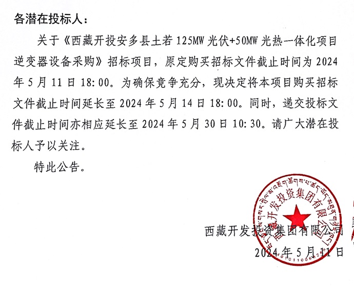 關(guān)于延長(cháng)《西藏開(kāi)投安多縣土若125MW光伏+50MW 光熱一體化項目逆變器設備采購招標》購買(mǎi)招標文件截止時(shí)間的公告