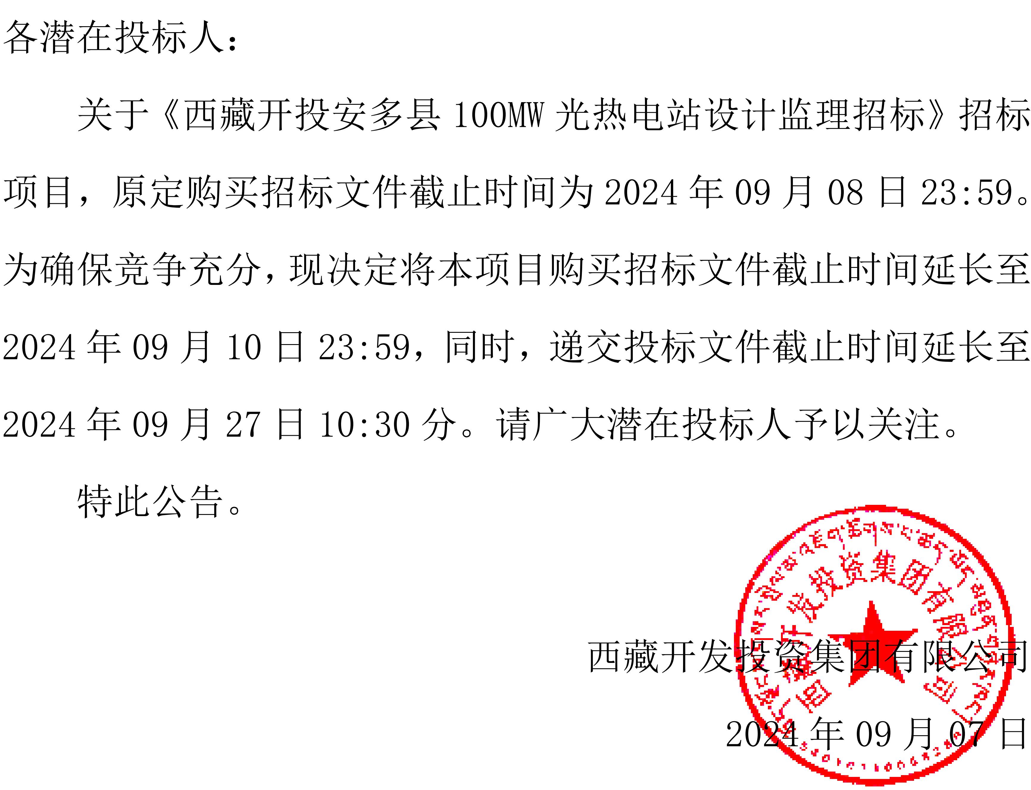 關(guān)于延長(cháng)《西藏開(kāi)投安多縣100MW光熱電站設計監理 招標》購買(mǎi)招標文件截止時(shí)間的公告