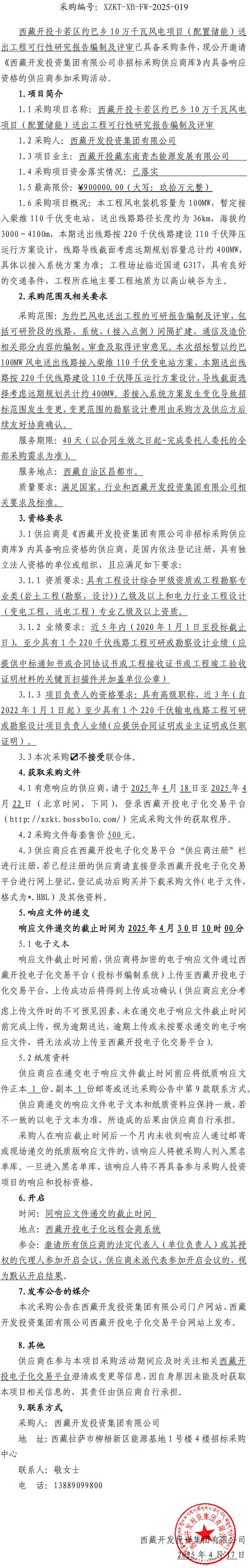 西藏開(kāi)投卡若區約巴鄉10萬(wàn)千瓦風(fēng)電項目(配置儲能)送出工程可行性研究報告編制及評審詢(xún)比采購公告