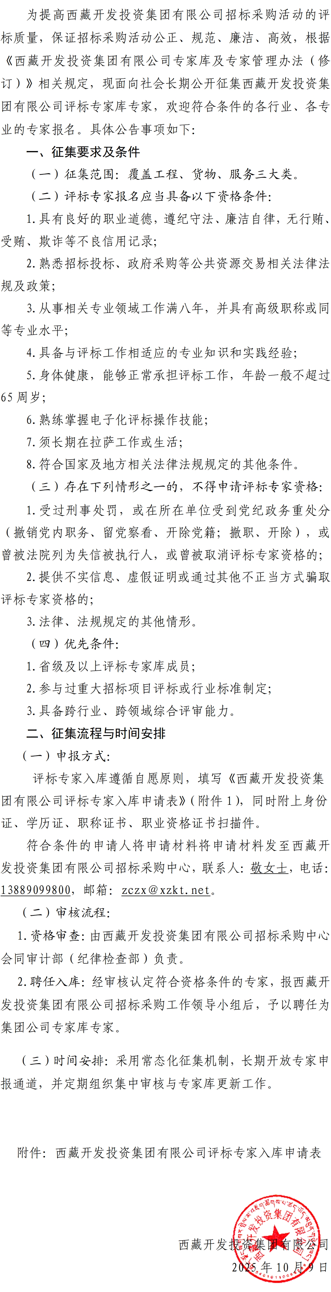 西藏開(kāi)發(fā)投資集團有限公司評標專(zhuān)家庫專(zhuān)家征集公告