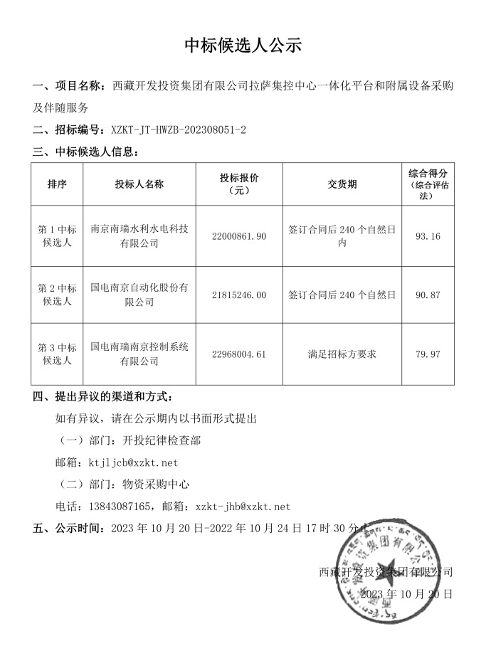 中標候選人公示(集控中心一體化平臺(二次)